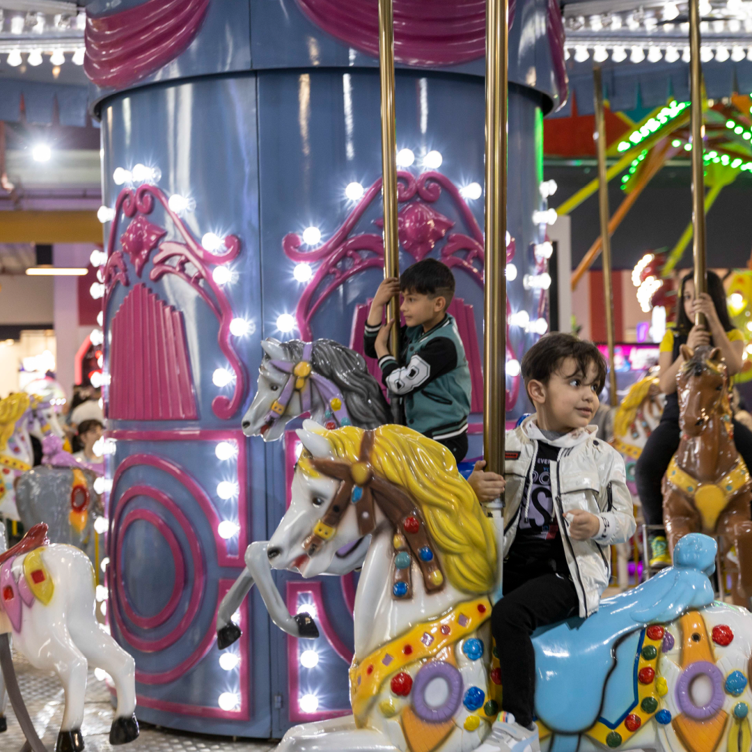 Let the kids enjoy a whimsical ride on our indoor carousel! Designed just for them, this classic attraction promises fun and laughter in a lively, playful setting.