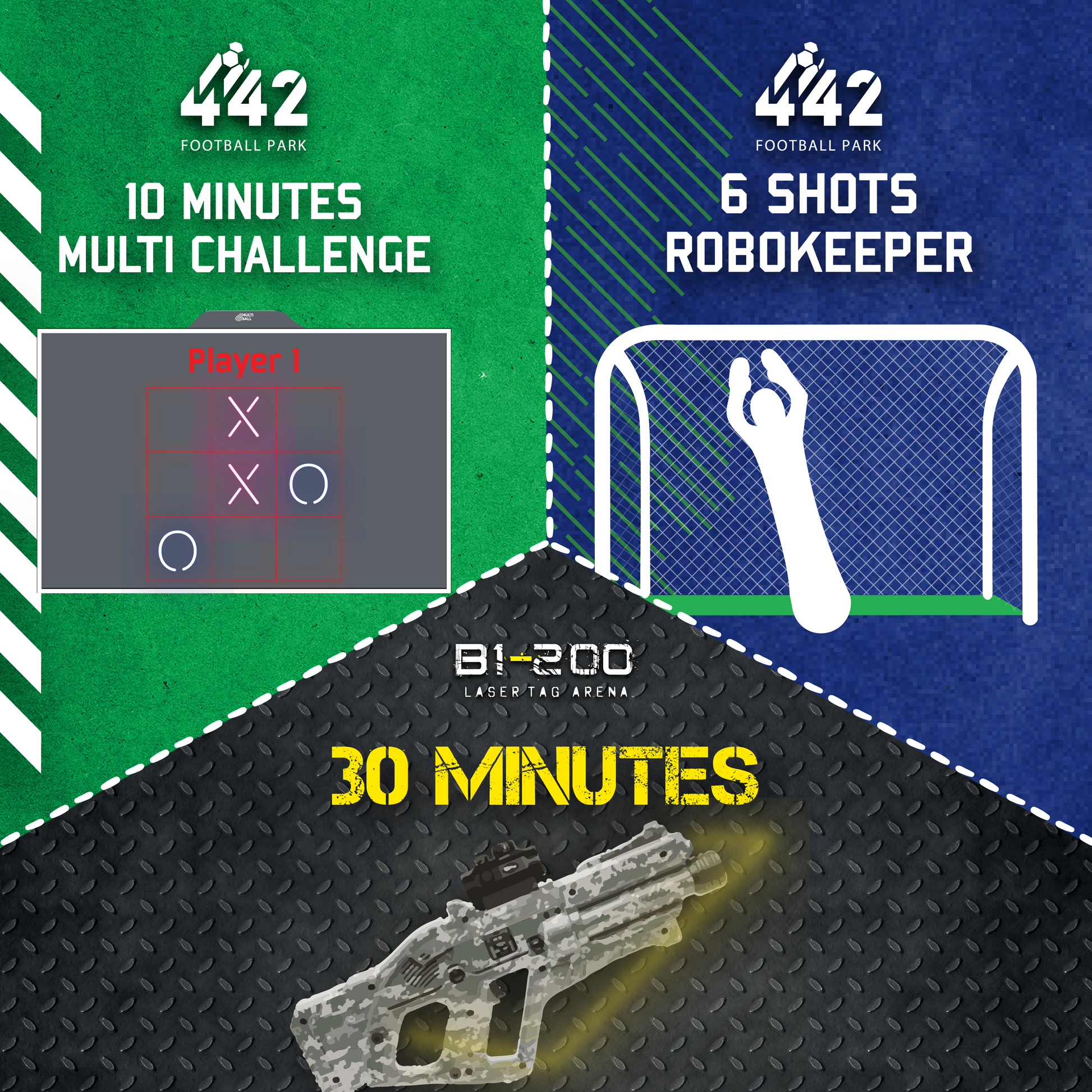 Enjoy access to 2 venues with 1 voucher: 30 minutes of laser tag at B1200 and 2 challenges at 442 Football Park. Only for 13 JOD